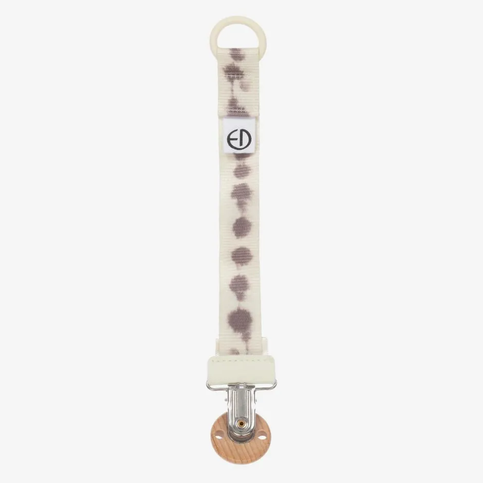 A practical dummy clip for baby boys and girls by Swedish brand Elodie, helping to keep your little one's dummy from getting lost or dirty. The ivory grosgrain ribbon strap has a dark grey tie-dye drops design with a faux leather trim and an 'adored' tab. The ring is made from durable silicone and the metal buckle is made from nickel-free steel with a lacquered wood covering. This item is made from recycled materials.
