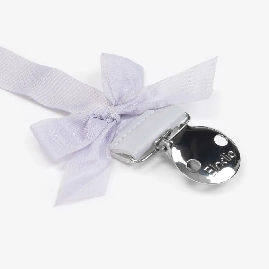 Lovely and practical, lilac purple dummy clip for baby girls by Swedish brand Elodie, decorated with a ribbon bow. Designed to help keeping your little one's dummy in place, the grosgrain ribbon strap has a branded, nickle-free steel clip on one end and a durable silicone ring on the other end. This item is made from recycled materials.