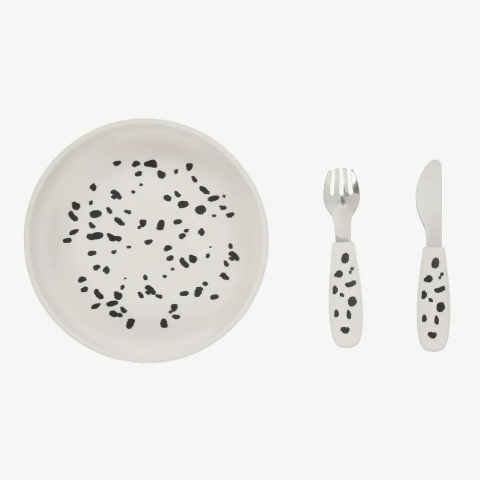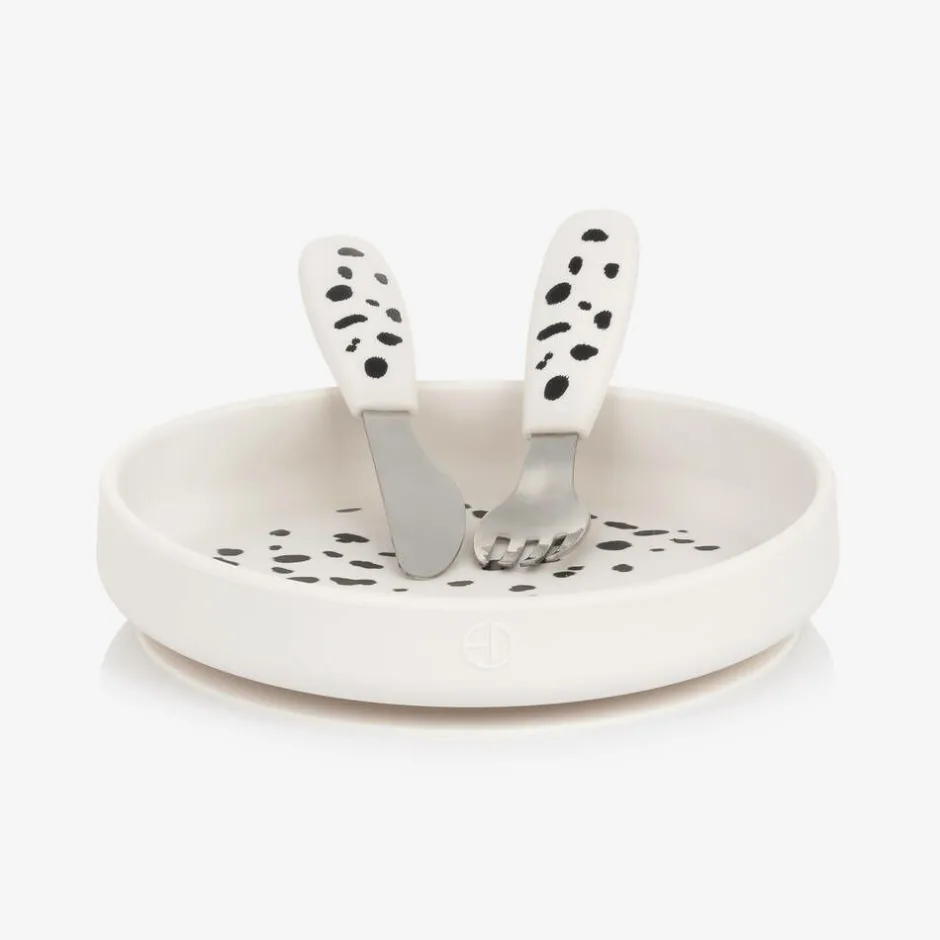 Elodie White Dalmatian Silicone Plate & Cutlery Set Hot
