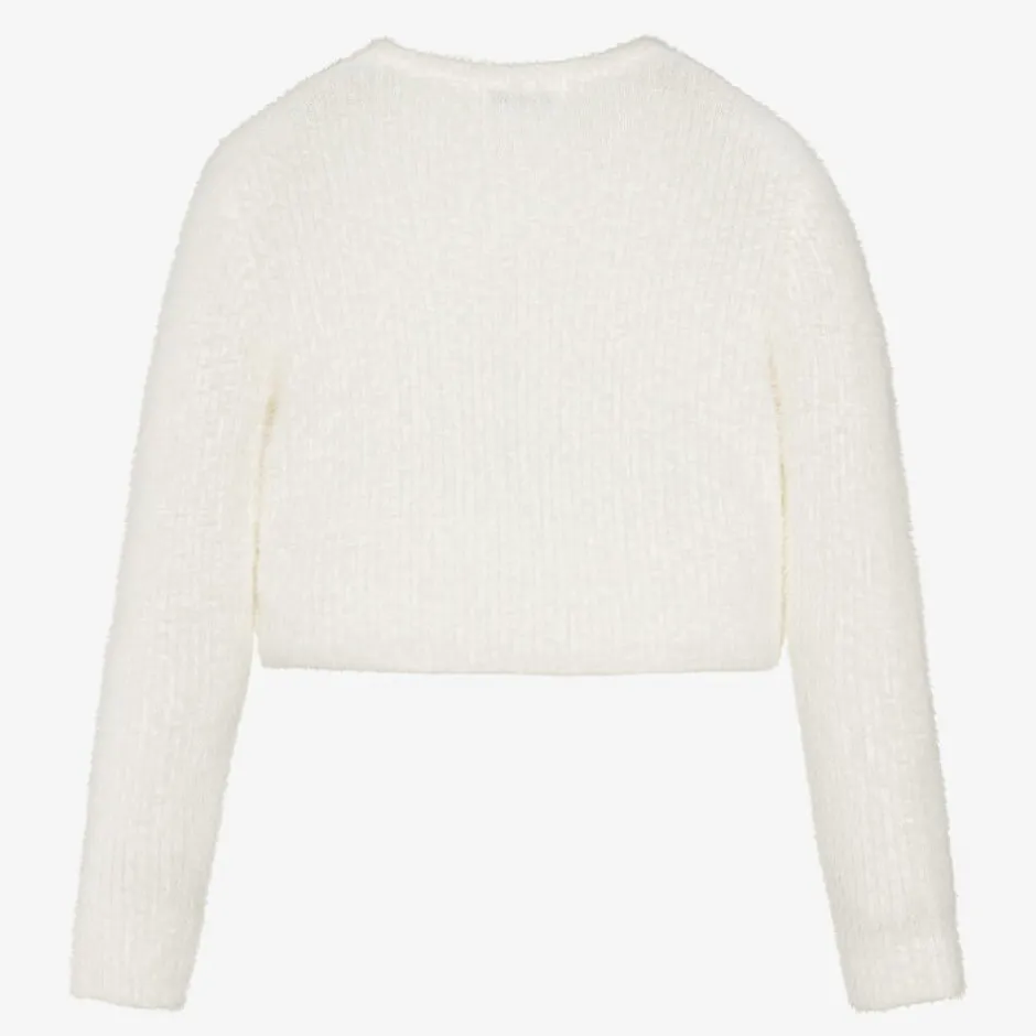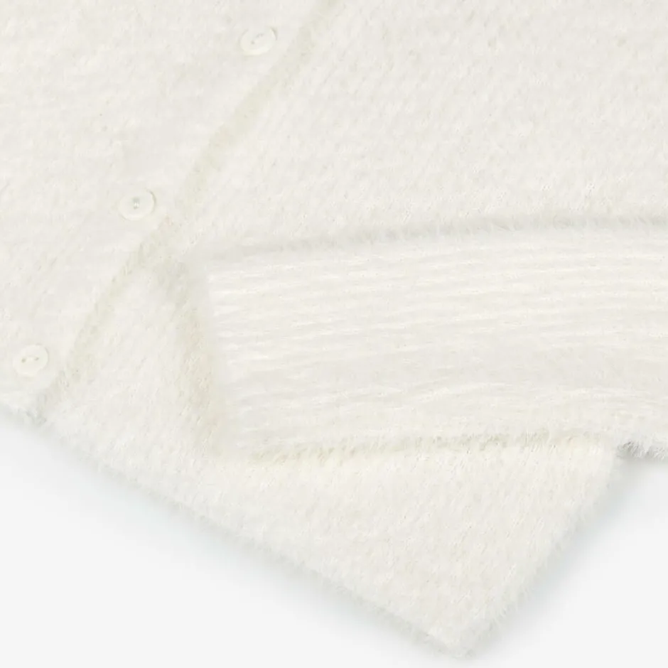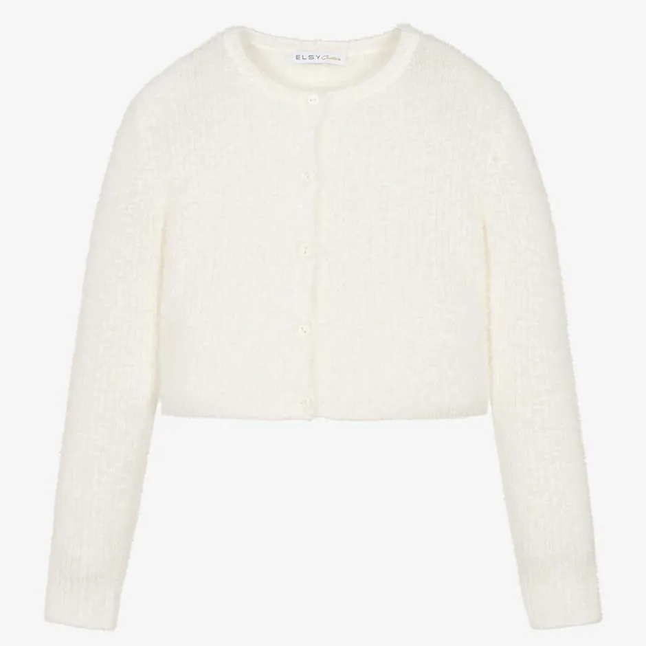 Ivory long-sleeved cardigan for girls by Elsy, in a super soft and cosy ribbed knit. Fabulously fluffy, it is just right as an extra layer on cooler days, and fastens with buttons on the front.
