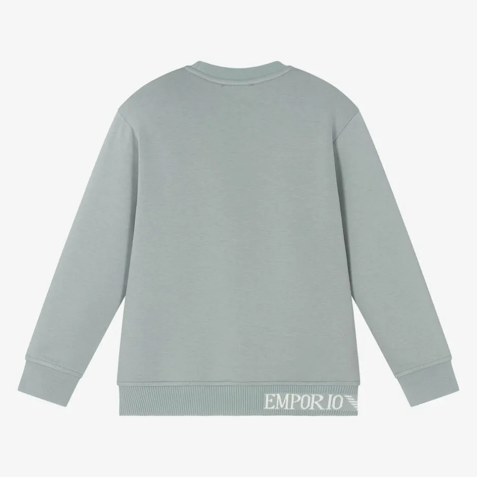 Green-blue cotton sweatshirt by iconic Italian designer Emporio Armani, adding a designer touch to boys casual wardrobe. Made in soft, lightweight jersey, it has long sleeves, ribbed trims and a jacquard Emporio Armani logo on the hemline.
