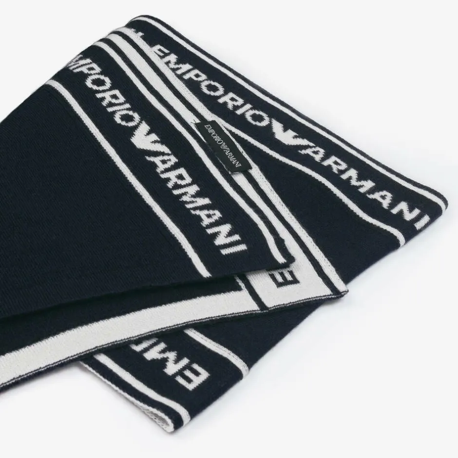 Navy blue scarf for boys by Italian fashion house Emporio Armani. The ideal accessory to add warmth and style to his winter outfit, it is finely knitted in a beautifully soft wool blend. For brand recognition, it is trimmed with white logo panels along the edges.