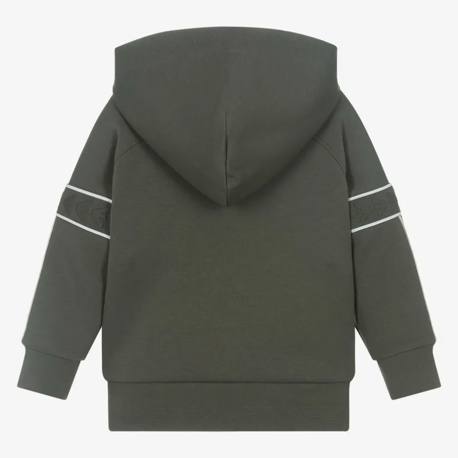 A khaki green hoodie for boys by Italian brand Emporio Armani, made in a wonderfully soft and stretchy cotton blend jersey. Ideal for adding a designer touch to their casual wardrobe, this comfortable top has dropped long sleeves detailed with the brand's iconic Eagle logo. To complete the relaxed look, it is styled with useful pockets on the front, a jersey-lined hood and stretchy ribbed cuffs and hem.