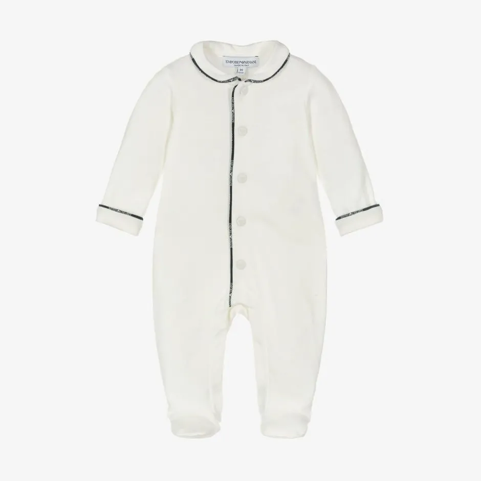 A lovely off-whte babygrow for boys by Italian brand Emporio Armani, made in comfortable cotton jersey. The edges have black trims, printed with a small repeat logo for a subtle designer touch. It has a cosy brushed feel on the inside, with branded popper fastenings on the front and between the legs to help with dressing.
