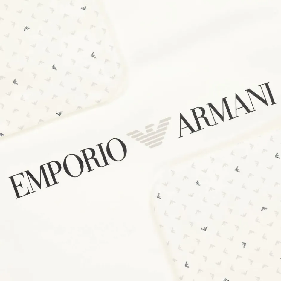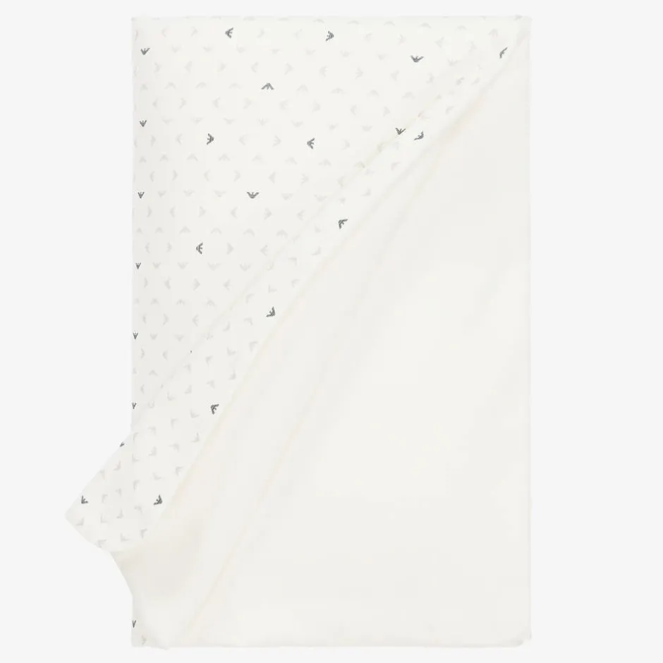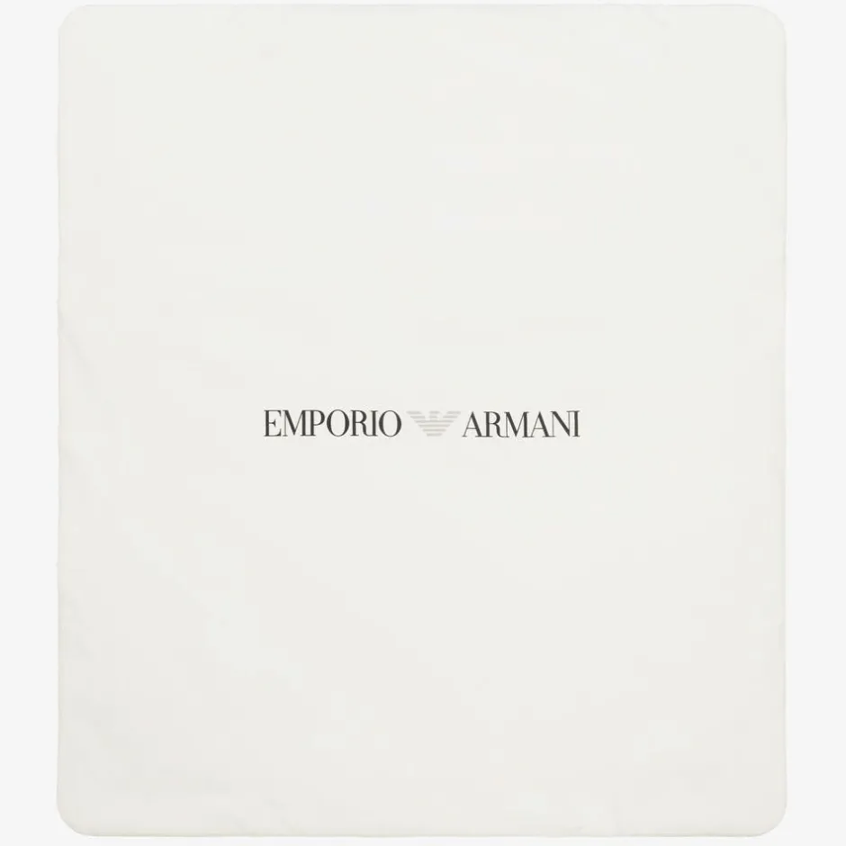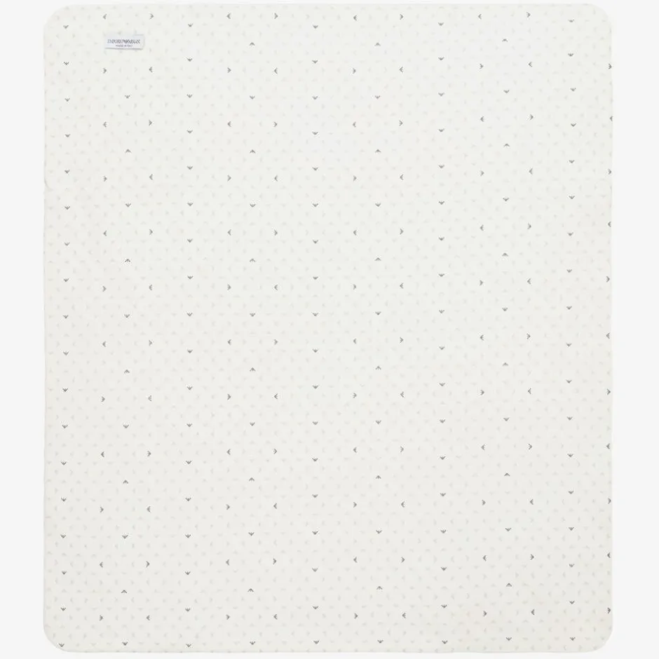 Ivory blanket for baby boys and girls by Italian brand Emporio Armani. Made in soft cotton jersey, it has the brand's logo printed on the front in black, with the reverse patterned in grey Eagle logos for a distinctly designer look. Softly padded, it is ideal for use in the pram when out and about or as a comfortable surface for baby to lie on.