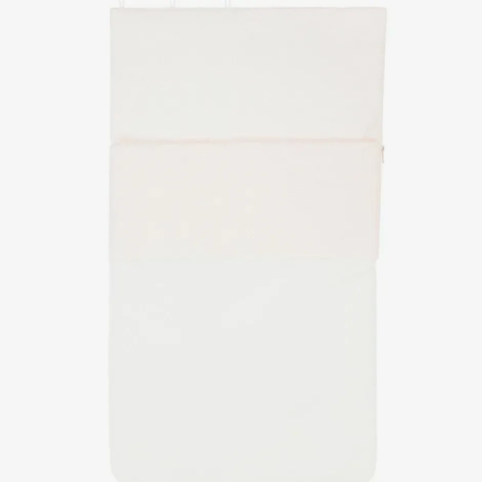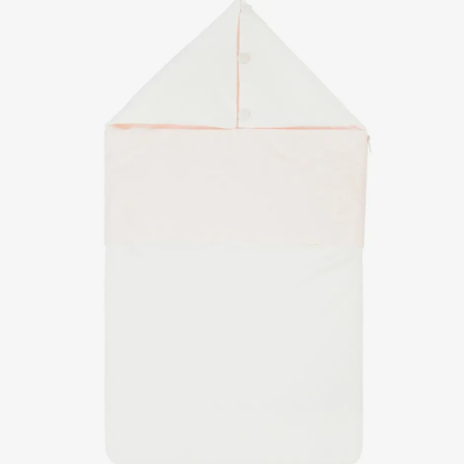 Ivory nest for baby girls by Emporio Armani, made in soft cotton jersey. The hood lining and front panel are made in luxury soft cotton, with a pale pink Eagle logo pattern. The nest is lightly padded and the hood can be unbuttoned and used as a pillow.