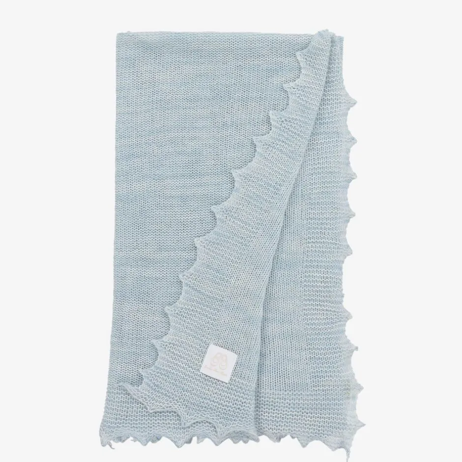 A lovely pale blue cobweb shawl by English Trousseau for baby boys and girls. It is made from the finest soft wool, knitted in Nottingham, England using ancient framed knitting techniques. Large enough to wrap around baby, the shawl makes an ideal gift and comes beautifully presented in a smart box.