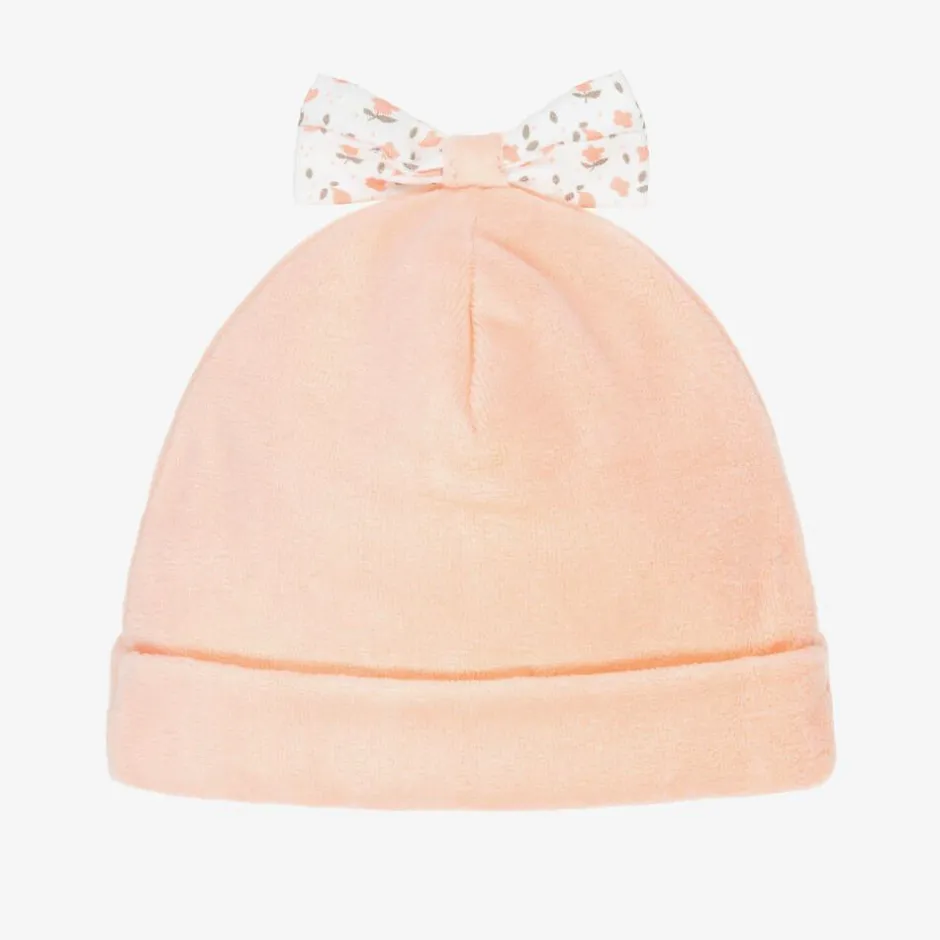 An adorable peach pink hat for baby girls by Everything Must Change, with a floral patterned bow on the top. It is made in beautifully soft velour with a comfortable jersey lining and a turned-up brim.