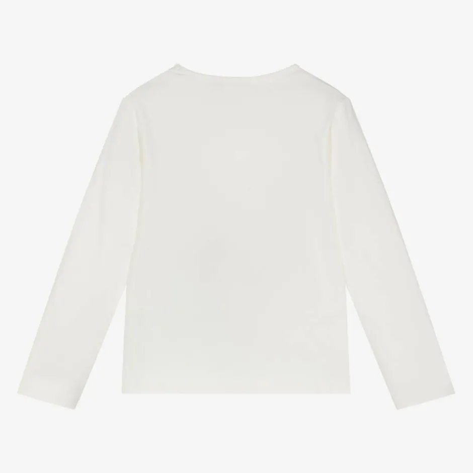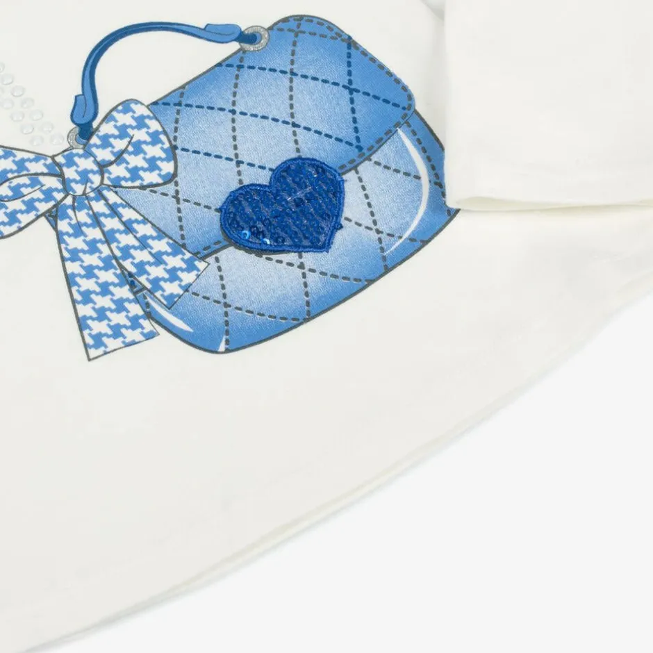Ivory top for girls by Everything Must Change, made in soft cotton jersey. It has a fabulous blue trompe l'œil bag print on the front, with sparkling sequins and 3D beads.
