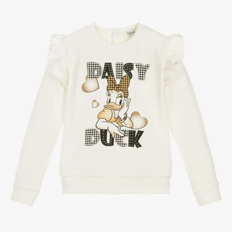An ivory long-sleeved top for girls by Everything Must Change, made from soft mid-weight cotton jersey with a fleecy interior. Part of the Disney capsule, it is printed with a beige and black Daisy Duck design with glittery gold elements and diamanté details for added sparkle. Trimmed with pretty frills over the shoulders, it fastens with poppers on the back of the neckline.