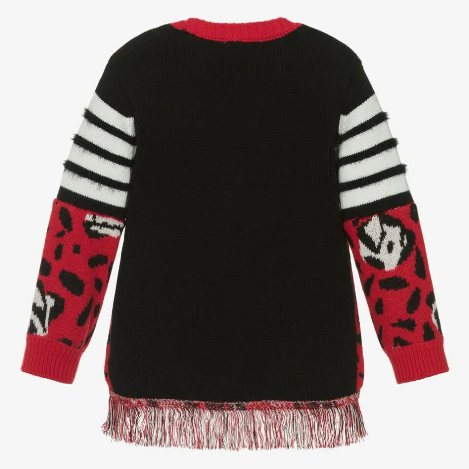 Girls red, white and black long-sleeved cardigan by Everything Must Change, with an abstract and stripe design. Made in a soft cotton and wool knit, this cosy piece has coordinating tassels trimming the hem. It has a V-neckline, stretchy ribbed cuffs and fastens with buttons on the front that are detailed with a little diamanté for added sparkle.