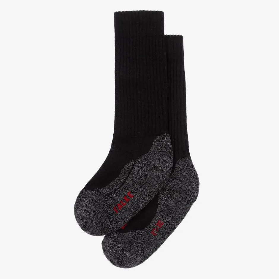 Black and grey calf-length hiking socks for boys and girls from the active range by Falke. Made in a wool blend that acts as thermal insulation, they are designed for warmth, moisture control and comfort.