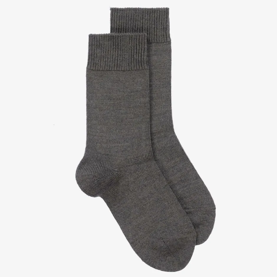 Girls and boys grey mid-length socks from Falke, made in a luxuriously thick and stretchy wool blend, with a soft cotton inside. They have comfortable ribbed cuffs, with reinforced stress zones for added durability.