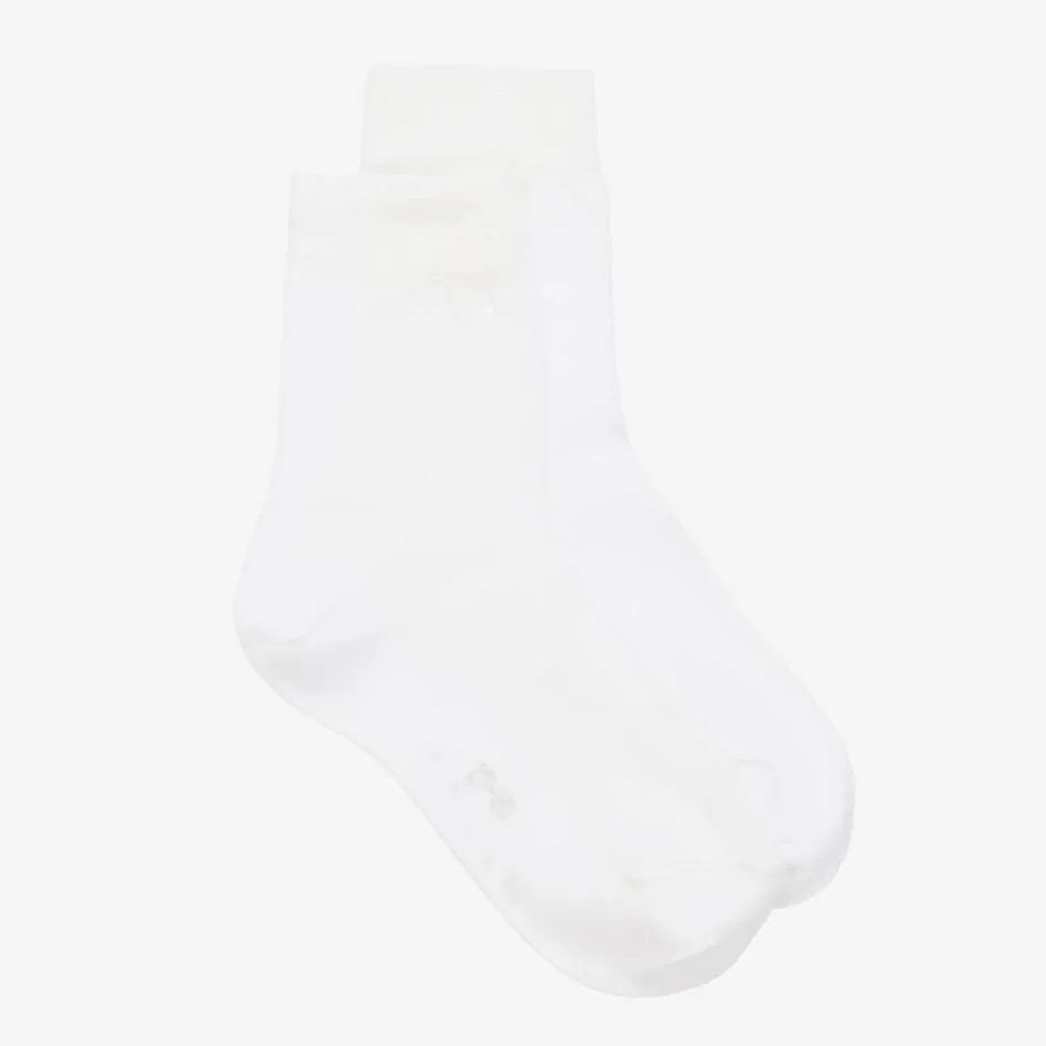 A pair of white luxury ankle socks for boys and girls by Falke. Made from a fine fil d'Ecosse cotton, with a slightly silky look. They have gently ribbed cuffs and reinforced stress zones for added durability.