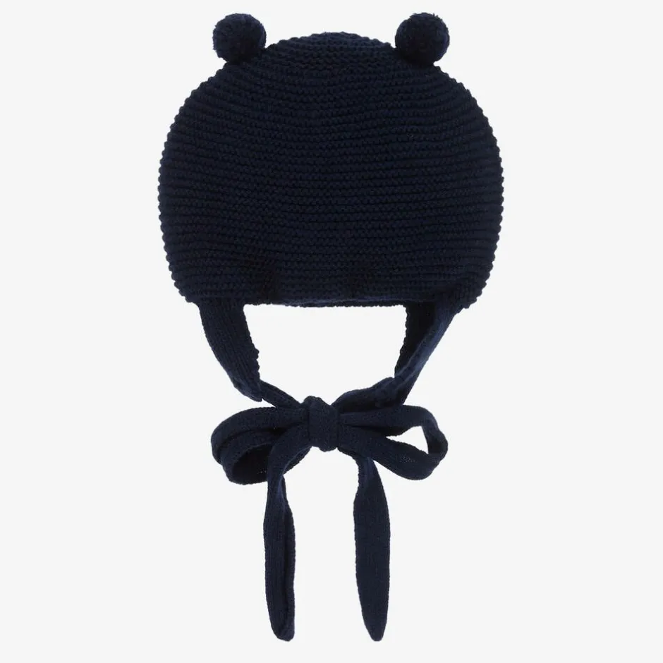 Cute and cosy for little boys and girls, this navy blue hat from Spanish brand Foque has two small pom-poms on the top. Knitted in a soft wool blend with a lovely garter stitch pattern, it has cosy ear flaps and fastens with knitted ties under the chin.