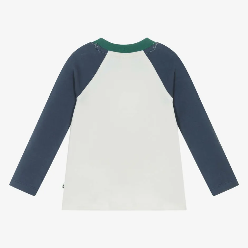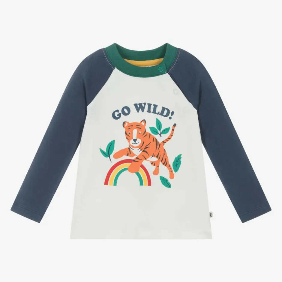 An ivory and navy blue top for younger boys by British designer Frugi, made in super-soft organic cotton jersey. This raglan-sleeve top has an adorable print of a tiger, rainbow and the words, 'Go wild!' on the front. It secures with poppers on the front, helping with over-the-head dressing.