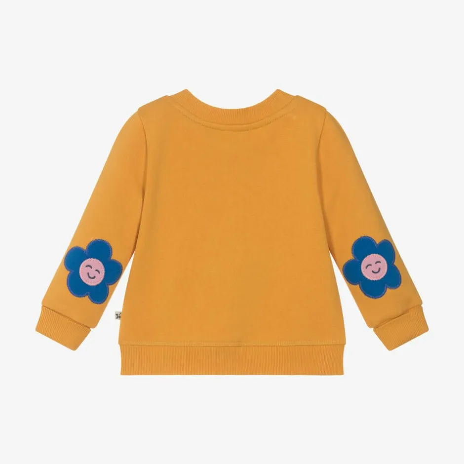 A charming mustard yellow long-sleeved sweatshirt for little girls by Frugi. Super sweet, it has three colourful appliqué flowers on the front with happy smiling faces and coordinating elbow patches for a fun finish. Made from soft organic cotton jersey with a cosy fleecy interior, it has tonal ribbed trims on the round neckline, the cuffs, and the hemline, and a logo tab on one side seam.