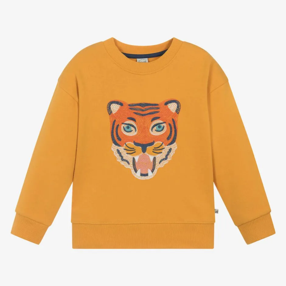 A golden yellow sweatshirt for boys and girls by Frugi, made in soft, mid-weight organic cotton jersey. A characterful tiger is embroidered intricately on the front for added fun. Dropped shoulders and ribbed trims complete the laid-back look.
