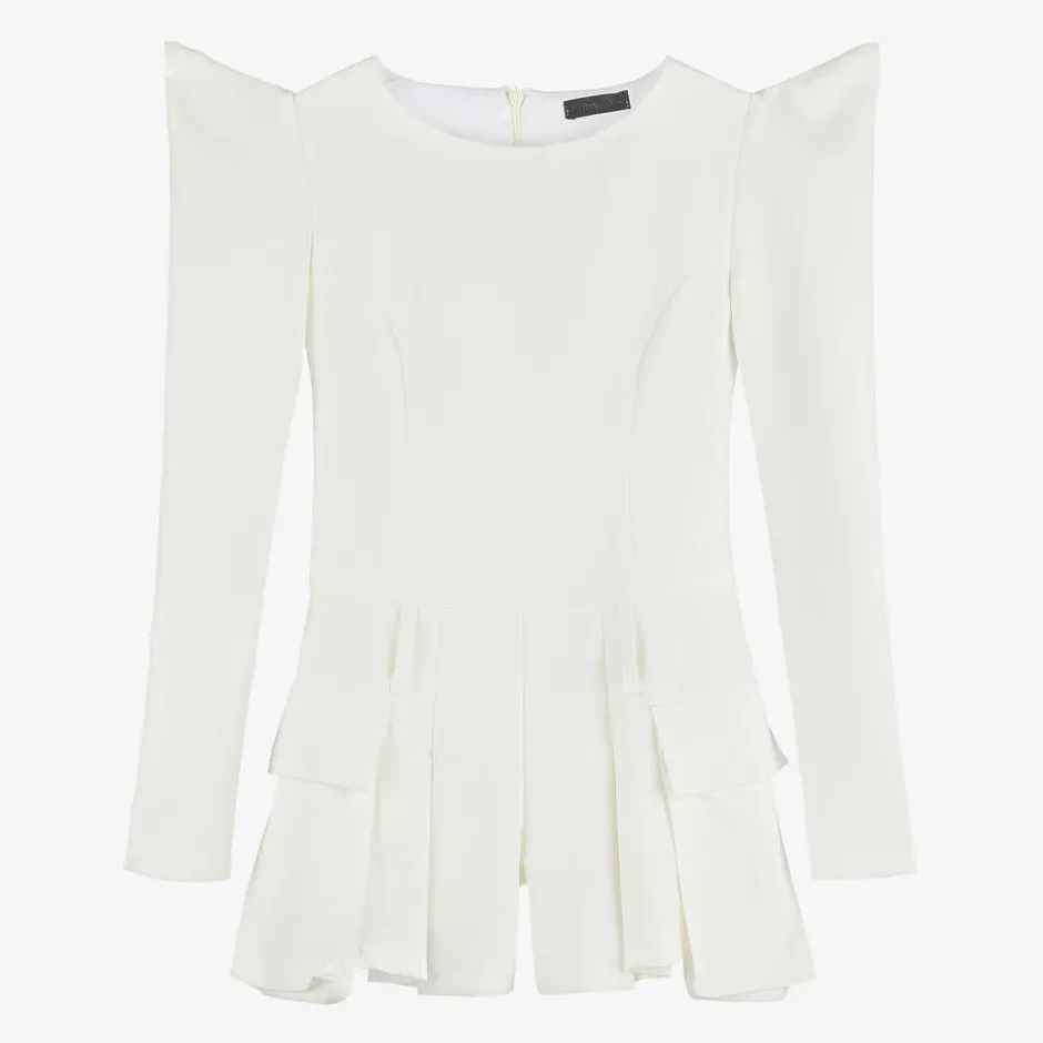 An off-white long-sleeved playsuit for older girls by Fun & Fun. Great for a bold and quirky style, it has pointed detailing on the shoulders and deep flap pockets on the pleated shorts that extend below the hemline. Smooth with added stretch, it fastens with a concealed zip on the back and has a detachable belt with a covered buckle on the front for a stylish finish.