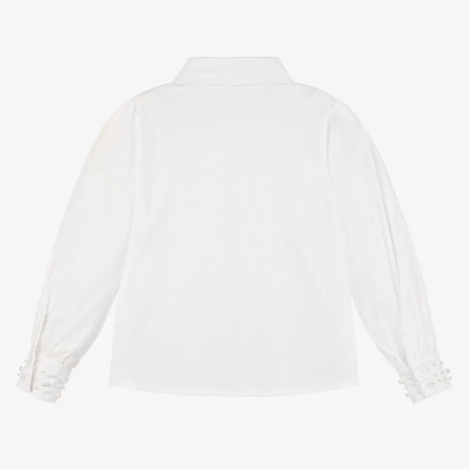 Designed by Fun & Fun, this white shirt for girls is made in soft cotton poplin. Shimmering faux pearls are embellished on the sleeves and the front pockets for an extra touch of glamour. It fastens with concealed buttons on the front for a sleek finish.