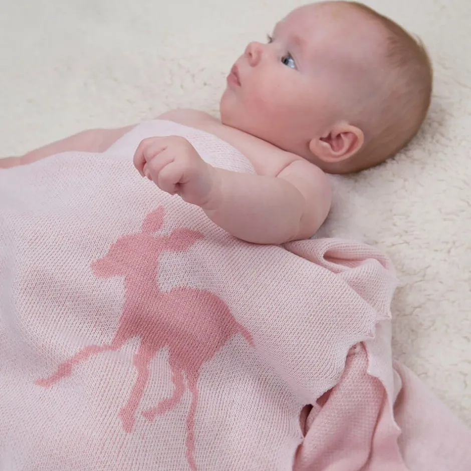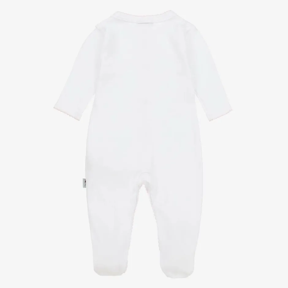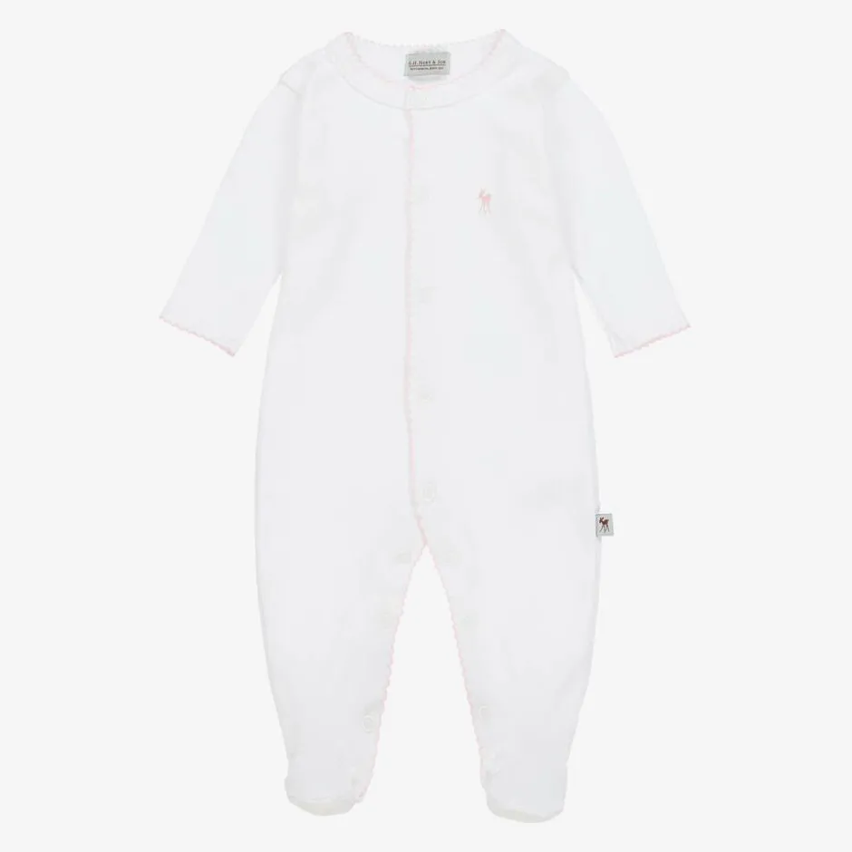 A white and pale pink gift set for baby girls by G.H.Hurt & Son, presented in a lovely gift box. Beautifully handcrafted by artisans, the gorgeous wool shawl has elegantly hand finished scalloped edges and a knitted Fawn motif, iconic to the brand. Made from a soft cotton-blend jersey, the adorable babygrow has a subtle embroidered trim and branded detailing printed on the chest. It fastens with poppers on the front and between the legs for easy dressing.