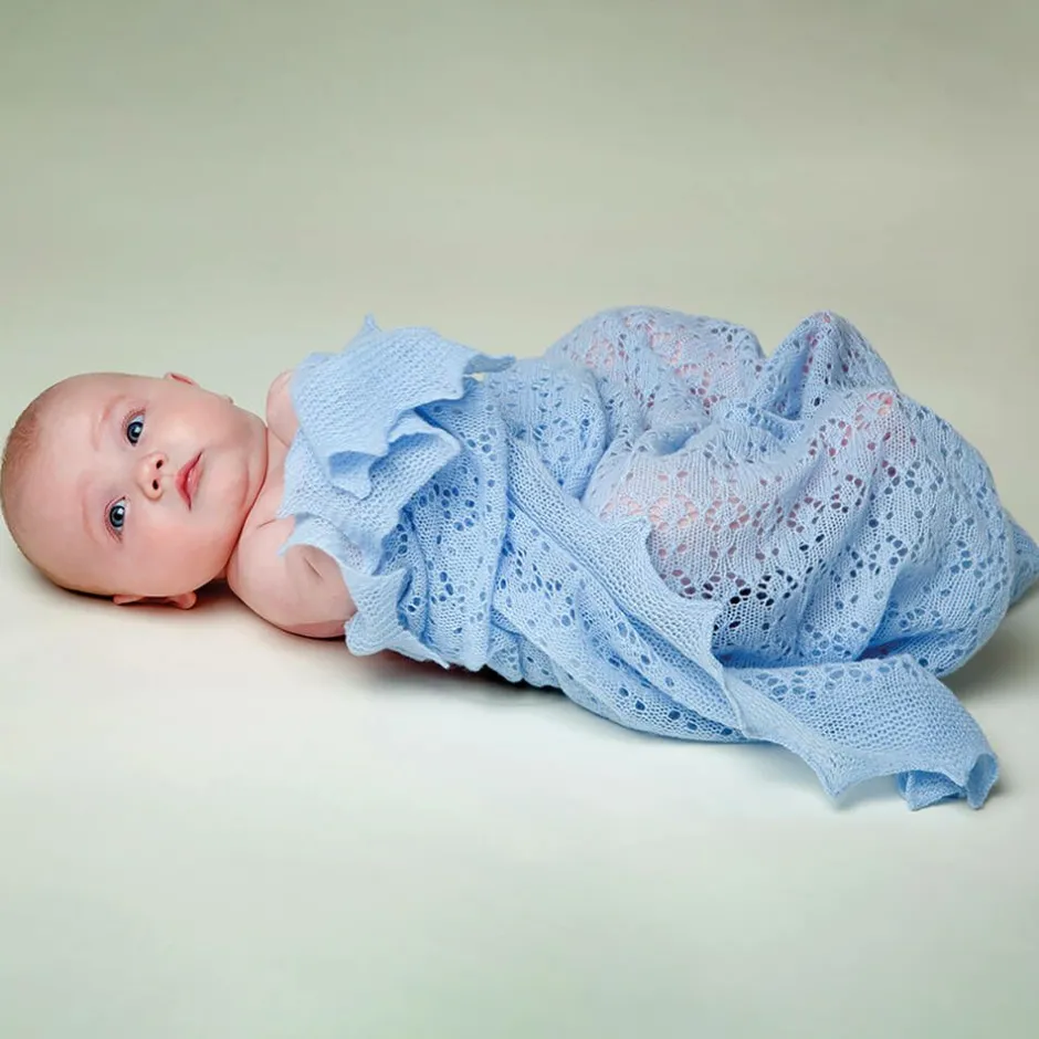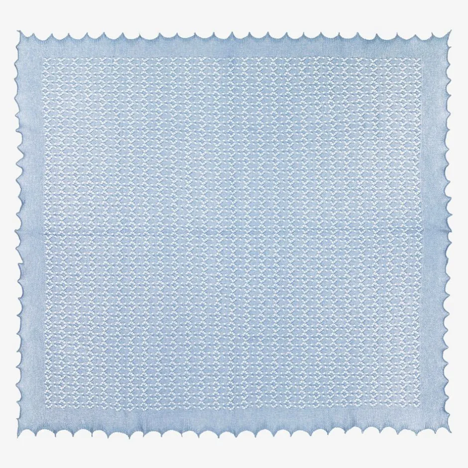 Beautiful pale blue shawl for baby boys and girls by G.H.Hurt & Son is presented in a charming gift box. Handcrafted by artisans on centuries-old wooden frames, it is knitted in sumptuously soft cashmere with a gorgeous lacey design. Elegantly hand finished with scalloped edges, this traditional shawl is cosy, comfortable, and will make a wonderful heirloom.