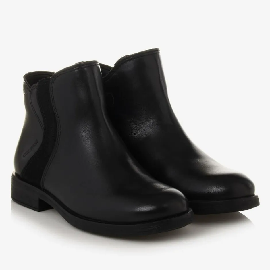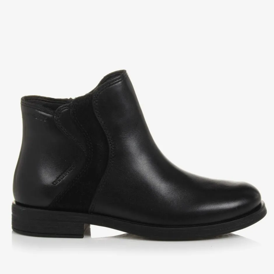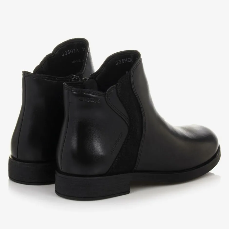Black ankle boots for girls by Geox, made in smooth, waterproof leather with a glittery side panel for a touch of sparkle. Lined for warmth, these comfortable boots have an ergonomic shape, with heel and toe protection. They are designed with removable, shock-absorbing insoles and have flexible, breathable outsoles with a waterproof membrane. They fasten with a zip and velcro tab on the side.