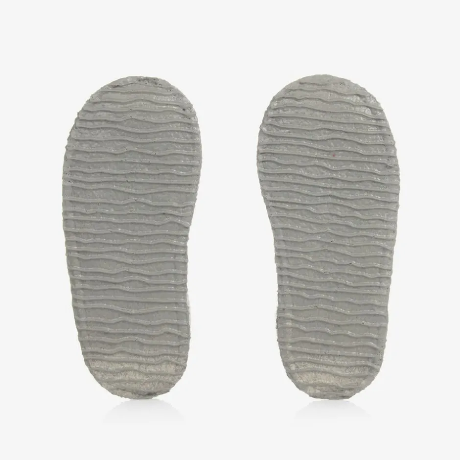 Pale grey slippers for girls by Giesswein, made from soft felted virgin wool. Easy to slip on they have a pink and silver glittery elasticated strap across the front and super flexible non-slip rubber outsoles. Embroidered on the toes are an adorable princess motif and a charming fairy-tale castle with diamanté decorations for added sparkle. There are black and red logo tabs on the side for a branded finish.