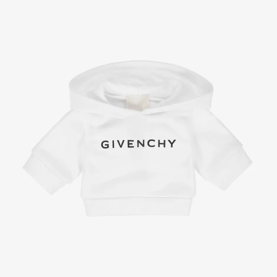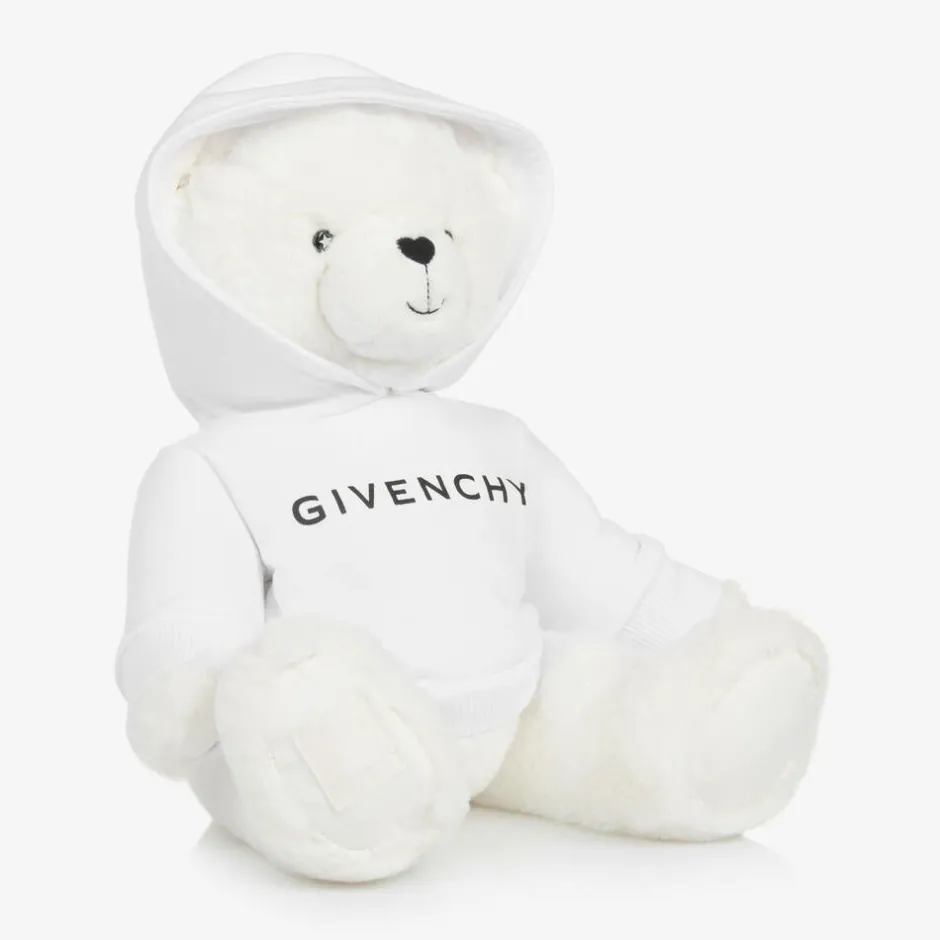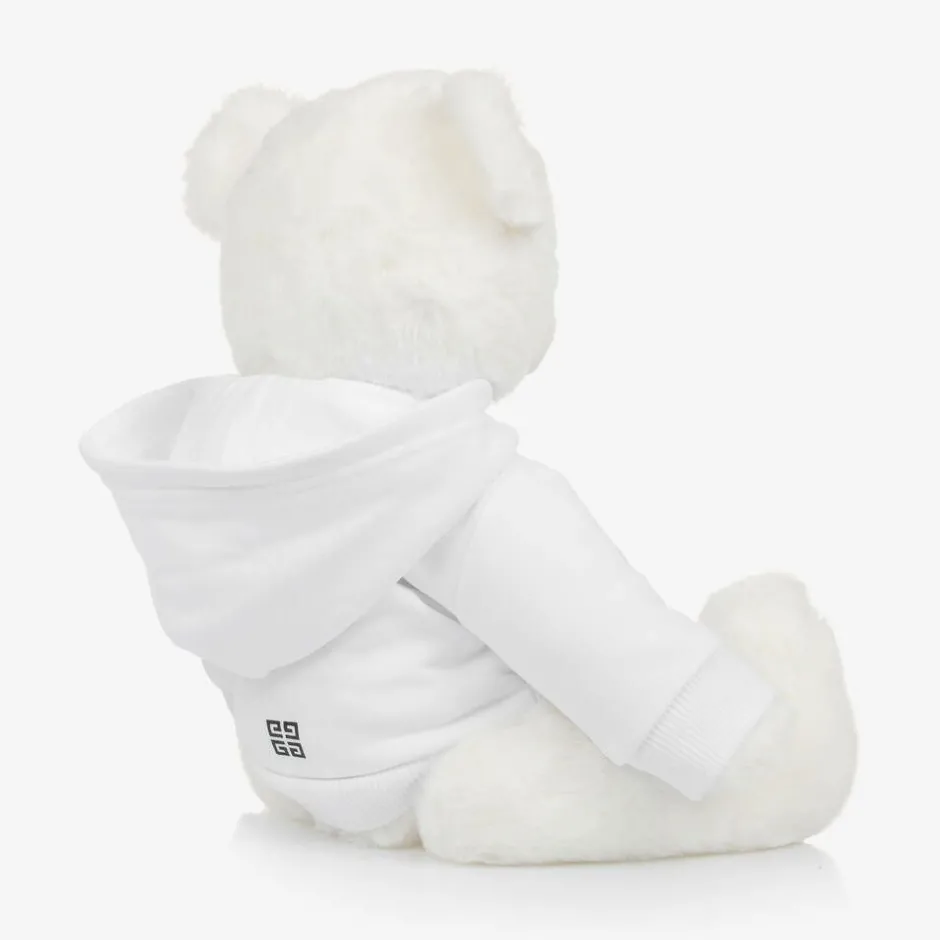 Adorable white teddy bear soft toy for boys and girls by luxury French brand Givenchy. Cute and characterful, this plush teddy has starry eyes, an embroidered heart-shaped nose and a logo patch on one foot. Adding a cool designer look, it wears a cotton jersey hoodie with a bold black Givenchy logo on the front and the iconic 4G logo on the back. Lovely for cuddles, it can also be used as a stylish nursery decoration.