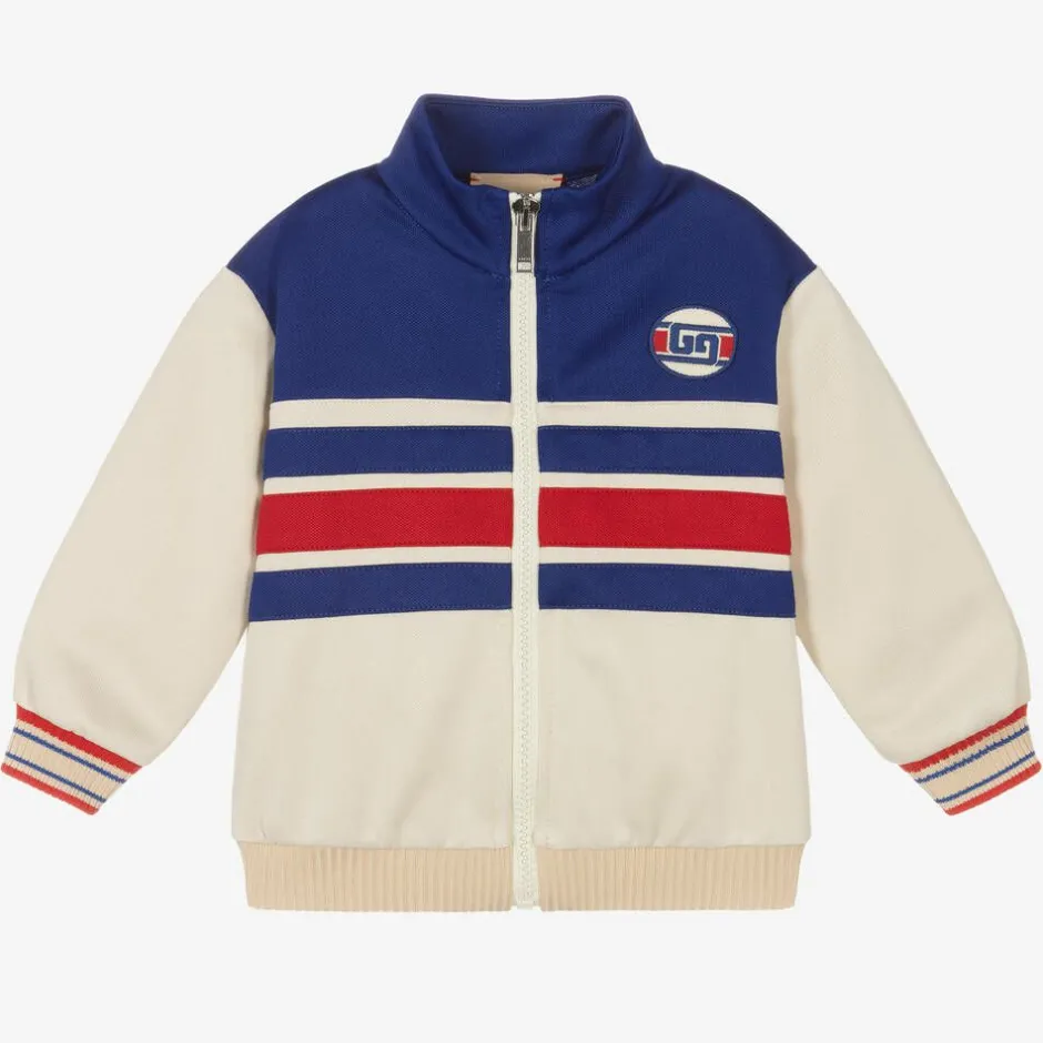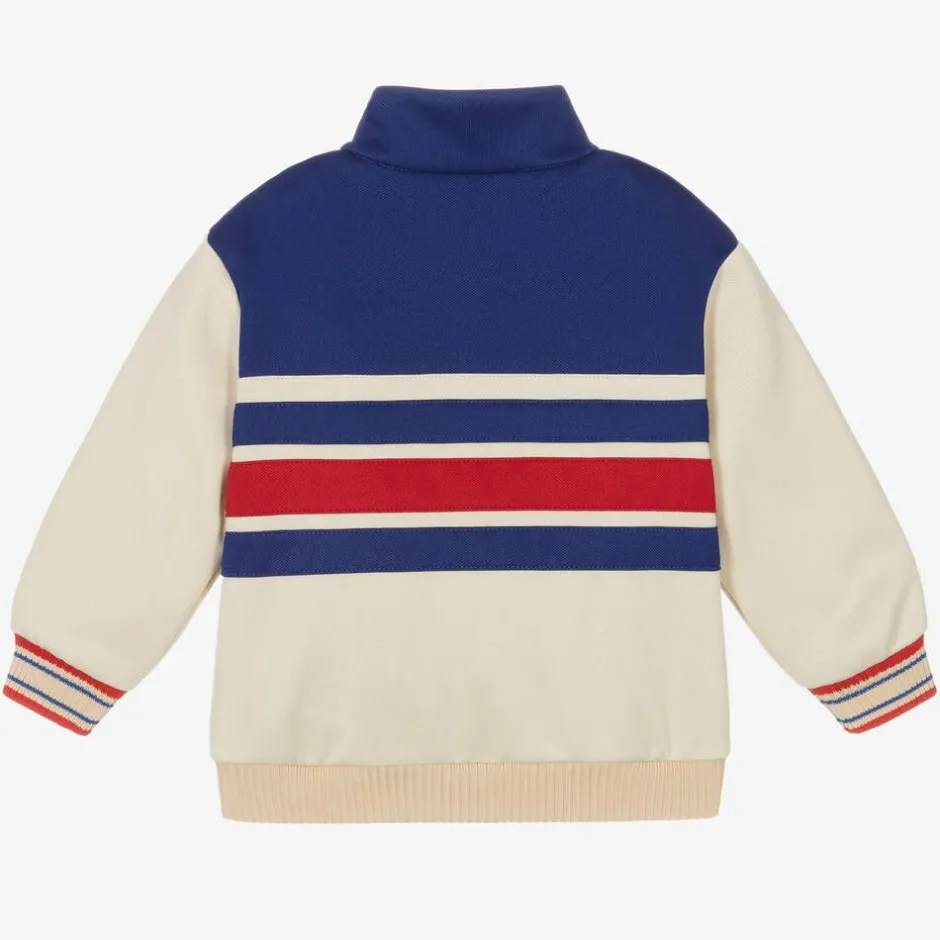 Blue, red and ivory zip-up top for baby boys from luxury Italian designer Gucci, inspired by retro sportswear. It is made in comfortable, cotton-blend technical jersey, with a 1970s-style embroidered logo patch on the chest. It has stretchy ribbed trims with stripes on the cuffs and a chunky silver logo-embossed zip for a designer finishing touch.