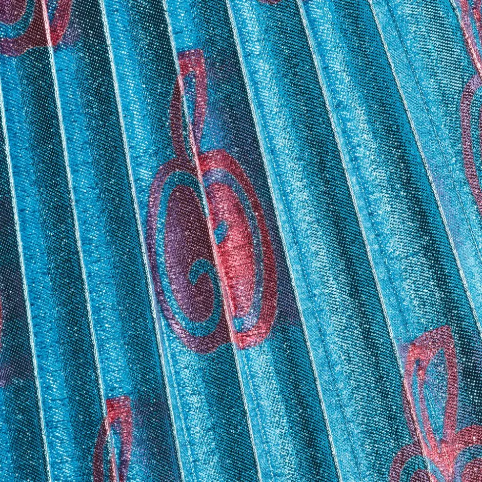 Shiny blue pleated skirt for baby girls by luxury brand Gucci, with pink GG apple motifs. It is made in silk with metallic thread, and has a soft crêpe lining. The skirt is below the knee length, and it has a black elasticated waistband