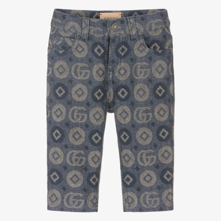 Stylish blue trousers for little boys and girls by luxury Italian brand Gucci, with the iconic Double G logo in a statement geometric pattern. Woven in soft cotton jacquard, they have an adjustable waistband for a comfortable fit. There are front and back pockets, with a branded popper fastening for a finishing designer touch.
