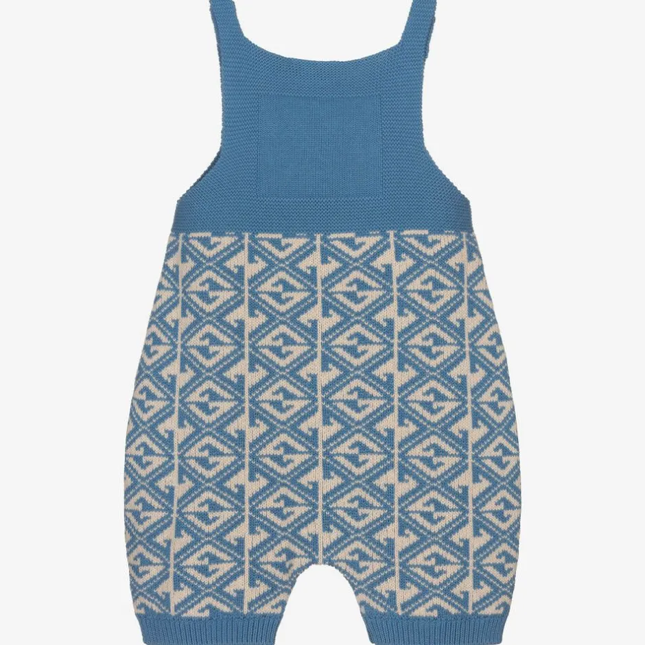 Baby boys and girls blue knitted dungaree shorts by luxury Italian brand Gucci. Made in soft cotton and wool, the designer's vintage-style rhombus GG pattern can be found in an all-over jacquard design with an intarsia box logo in beige. There are branded decorative buttons on the adjustable shoulder straps, and it fastens with poppers between the legs.