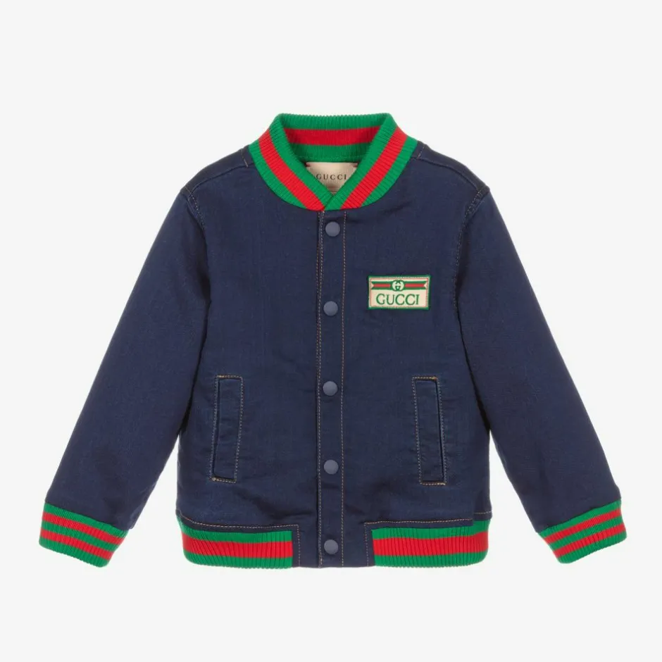 Dark blue bomber jacket for boys and girls by luxury Italian brand Gucci, made from mid-weight cotton jersey with the look of denim. With a cool vintage inspired logo badge on the front, the jacket has contrast yellow stitching and the signature green and red Web stripe on the ribbed trims.