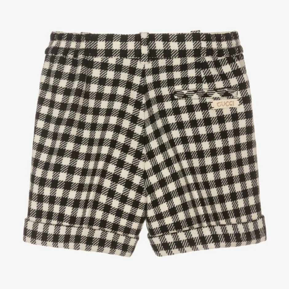 Boys black and ivory gingham check shorts by Italian fashion house, Gucci. They are tailored in luxuriously warm wool with soft pleats on the front, fixed turned-up cuffs and full lining for comfort. There are sleek pockets on the side seams and one on the back with an ivory and gold Gucci tab. The waistband is partly elasticated and fasten with a button and zip on the front.