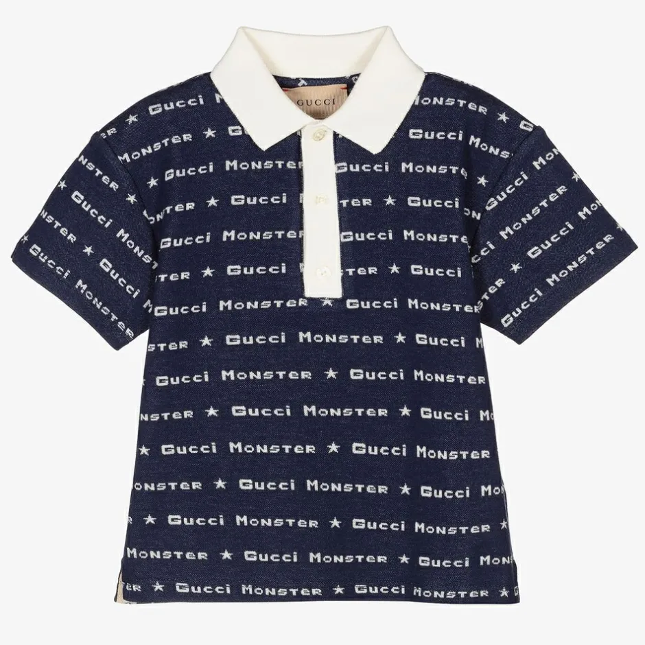 Navy blue polo shirt for little boys by luxury Italian brand Gucci, with an all-over 'Gucci Monster' and star jacquard logo. Made in soft cotton piqué, it has an ivory ribbed collar and placket, with front button fastenings