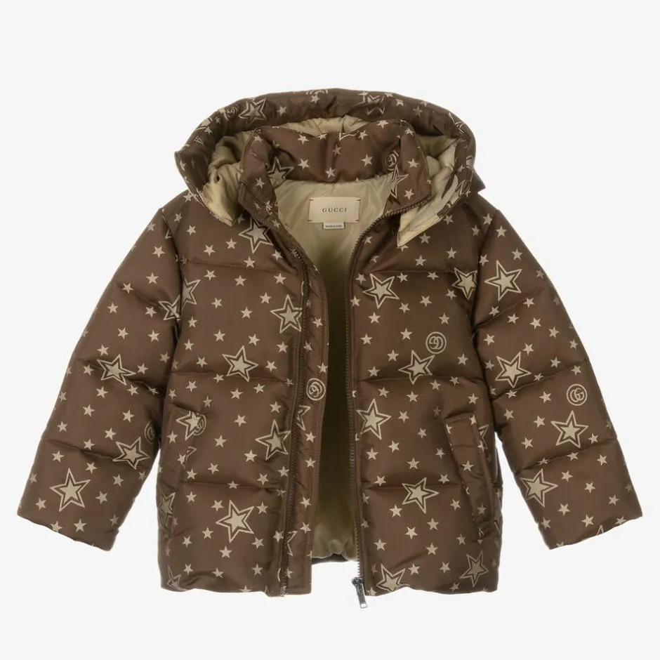 A brown puffer jacket for boys from Italian designer Gucci, padded with warm and luxurious down. Soft and smooth, the fabric is signed with intricately woven jacquard stars and Double G branding in beige, making this a true statement piece. Helping to protect him from the elements are the elasticated cuffs and hem, a large hood which fastens with velcro on the front, and cotton-lined pockets. Lined with silky fabric, it fastens with a branded silver-tone front zip for simple dressing.