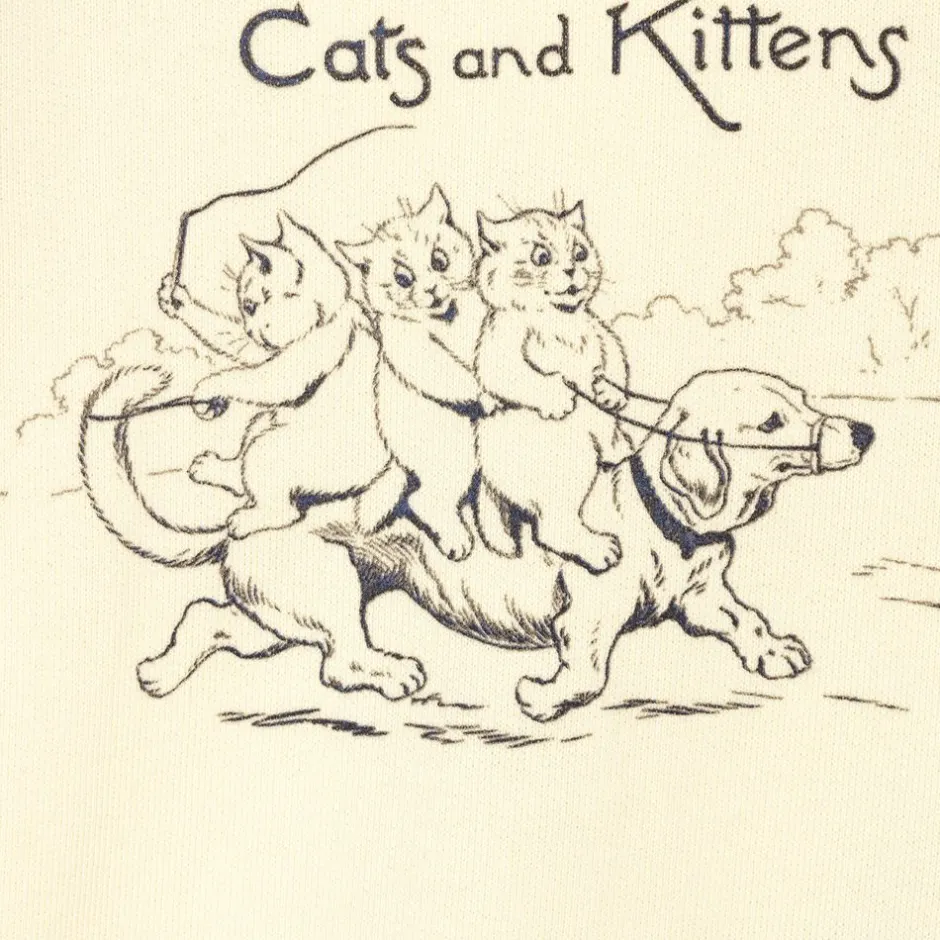 Dark ivory sweatshirt for little boys by luxury Italian brand Gucci. It is made in mid-weight cotton jersey, with popper fastenings on the raglan sleeve. The front has a black 'Big dogs little dogs cats and kittens' vintage print on the front, inspired by the works of 19th century illustrator Louis Wain. There is a black and white Gucci patch on the back.