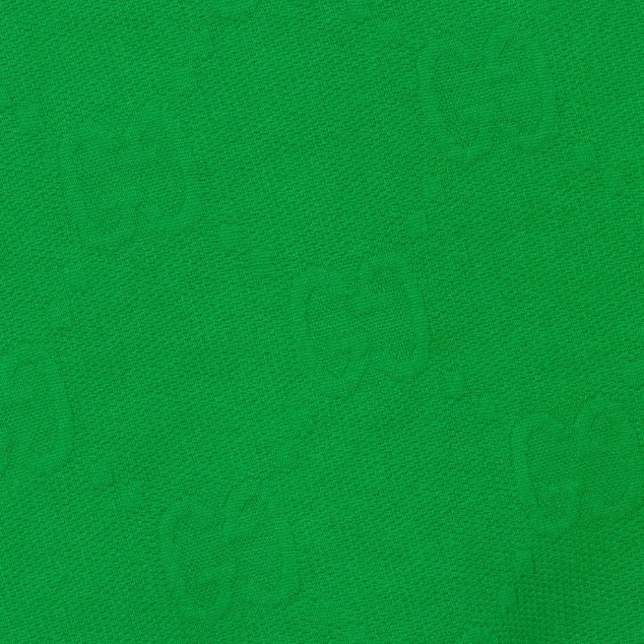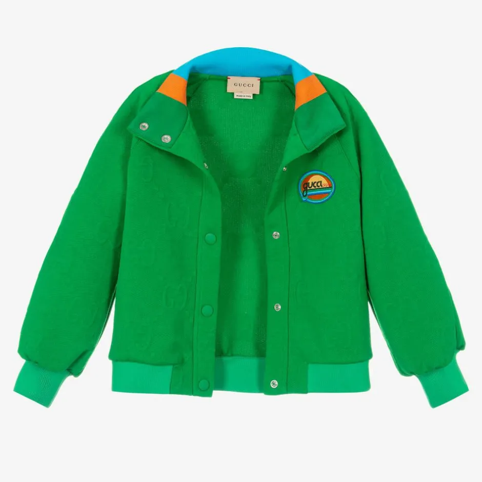 A bright green track jacket for girls by luxury Italian brand Gucci, inspired by retro sportwear. Made in comfortable jacquard jersey, it features the designer's all-over GG logo for a distinctive look. A colourful sunset logo patch is appliquéd on the chest, with coordinating colours on the inside collar. Fastening with branded poppers, the jacket has raglan sleeves and stretchy ribbed trims.