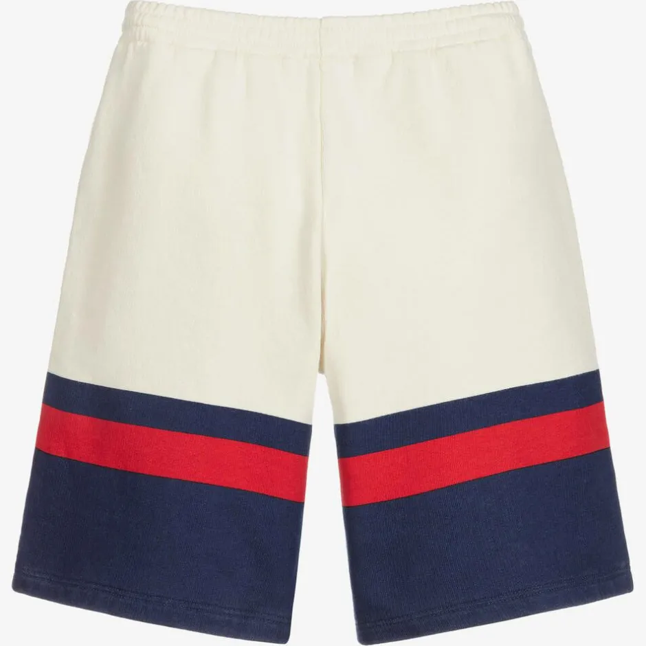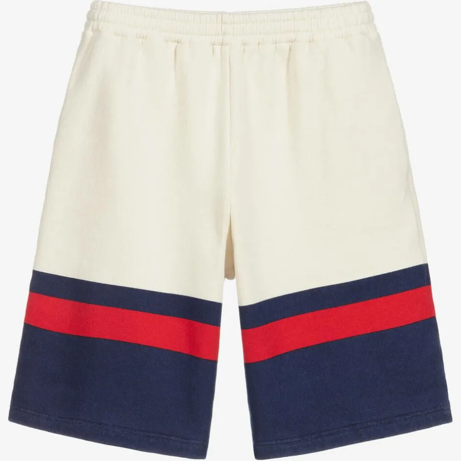 Ivory shorts for boys by luxury Italian brand Gucci, made in soft, mid-weight cotton sweatshirt jersey. They have red and navy blue stripes on the legs, inspired by the Gucci Web. There is one side seam pocket and a comfortable elasticated waistband.