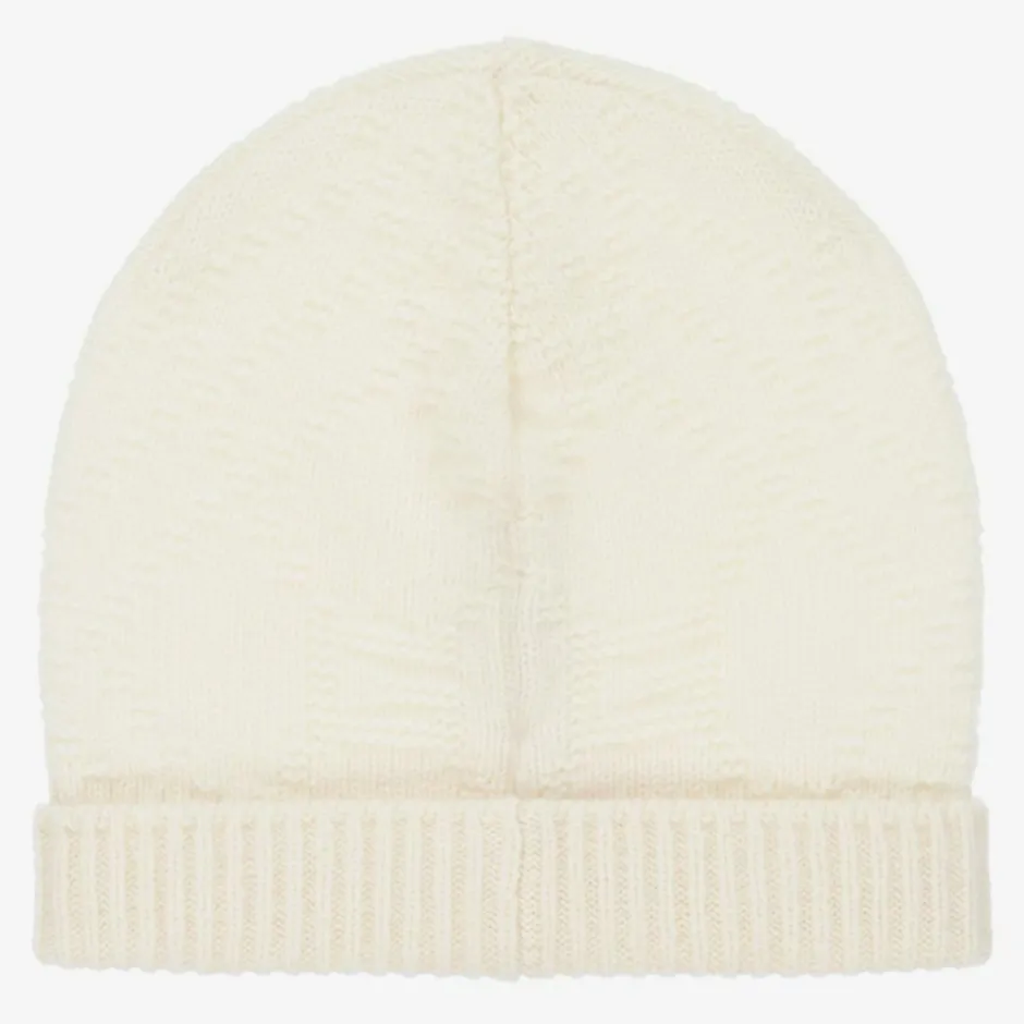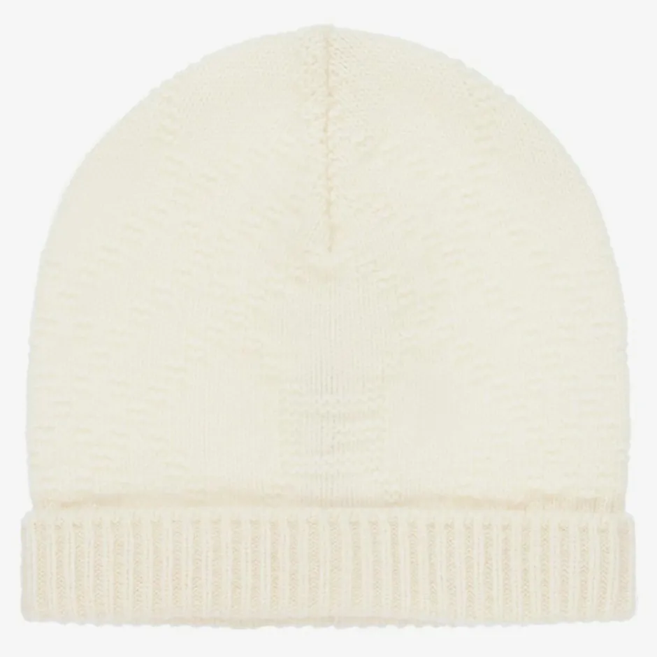 A sweet ivory hat for baby boys and girls by luxury Italian brand Gucci, knitted in luxuriously soft cashmere. It has a ribbed, turn-up brim and G logo pattern within the knit.