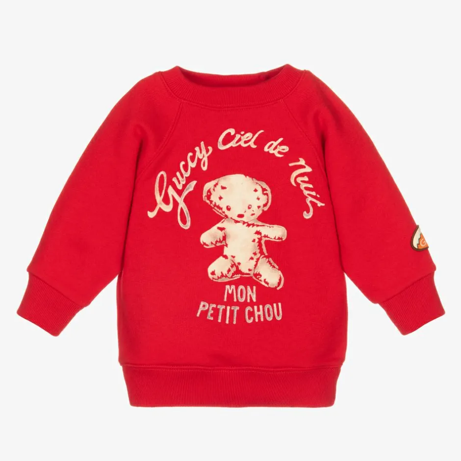 Red cotton sweatshirt for baby boys and girls by luxury Italian brand Gucci. The front has 'Guccy ciel de nuit mon petit chou' and a lovely teddy bear in a beige velvet print. The French phrase references a nickname for the house, the night sky and a term of endearment. It has an orange logo patch on the raglan sleeve and popper fastening on the back.