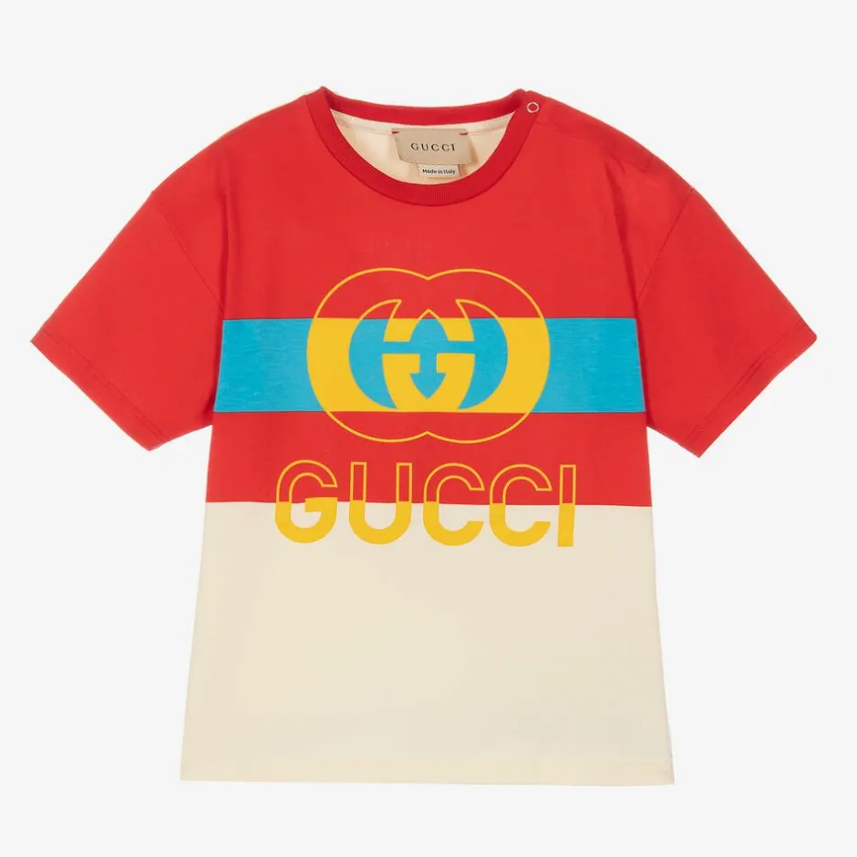 Suitable for baby boys and girls, a red and ivory cotton T-shirt by luxury brand Gucci, made in soft, breathable jersey. With a retro and sporty look, this casual piece is printed with Gucci's iconic interlocking G logo in yellow, combined with a bright blue stripe across the chest.