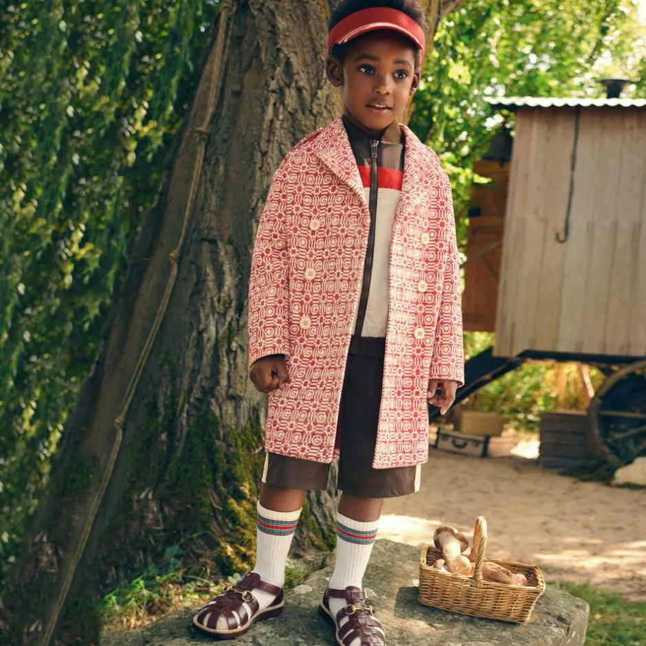 Red and ivory coat for boys by luxury Italian designer Gucci, made in a soft cotton jacquard weave. It is beautifully decorated with the brand's G motif within a repeating pattern. With a traditional feel, it has a notch lapel and double-breasted front button fastenings. It is fully lined in silky cupro and has decorative front flap pockets.