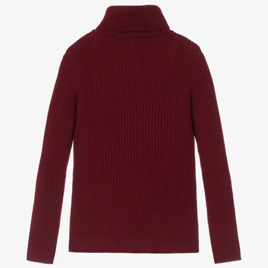 Gorgeous burgundy red wool roll neck sweater for boys and girls by luxury Italian brand Gucci, featuring the iconic Interlocking G logo embroidered on the chest. Made from a luxuriously soft and stretchy ribbed knit, and with a close-fitting silhouette, this top is cosy, comfortable, and effortlessly stylish.