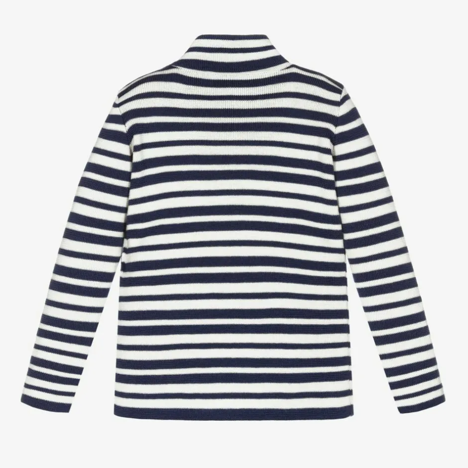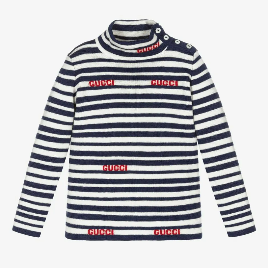 Younger boys and girls wool roll neck sweater by luxury brand, Gucci. Forming part of the Ouverture collection, this retro-inspired knit in white and navy blue stripes is soft and stretchy, with an intarsia weave of the design House's classic logo in red.