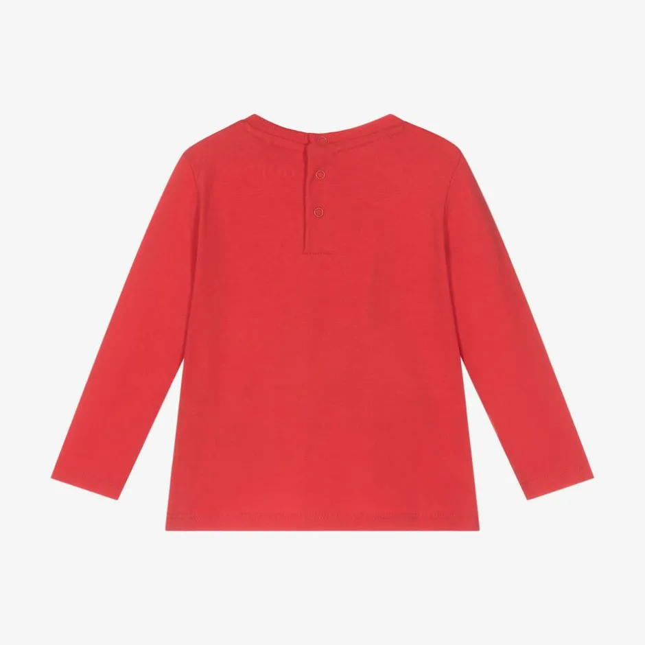 A red long-sleeved cotton top for baby boys by Guess. For a good vibe, the front has a colourful print of the iconic triangle logo in a fun cartoon-style graphic and 'be kind' slogan. The popper fastenings on the back allow easier dressing. This casual jersey top contains organic cotton fibre.
