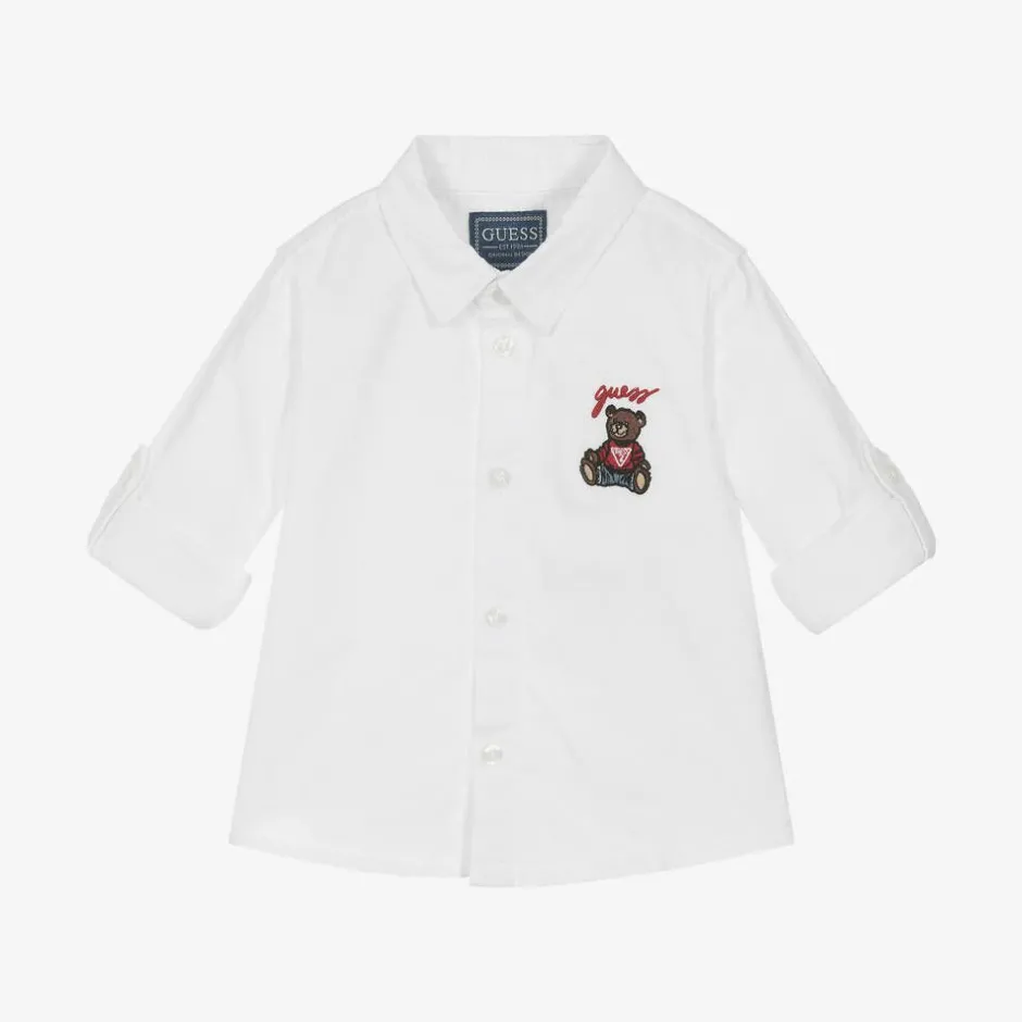White shirt for baby boys by Guess, made in soft, mid-weight cotton. It has a colourful bear embroidered on the chest with a red logo above. It fastens with branded buttons on the front and for versatile wear the long sleeves can be rolled up and secured with a button fastening tab.