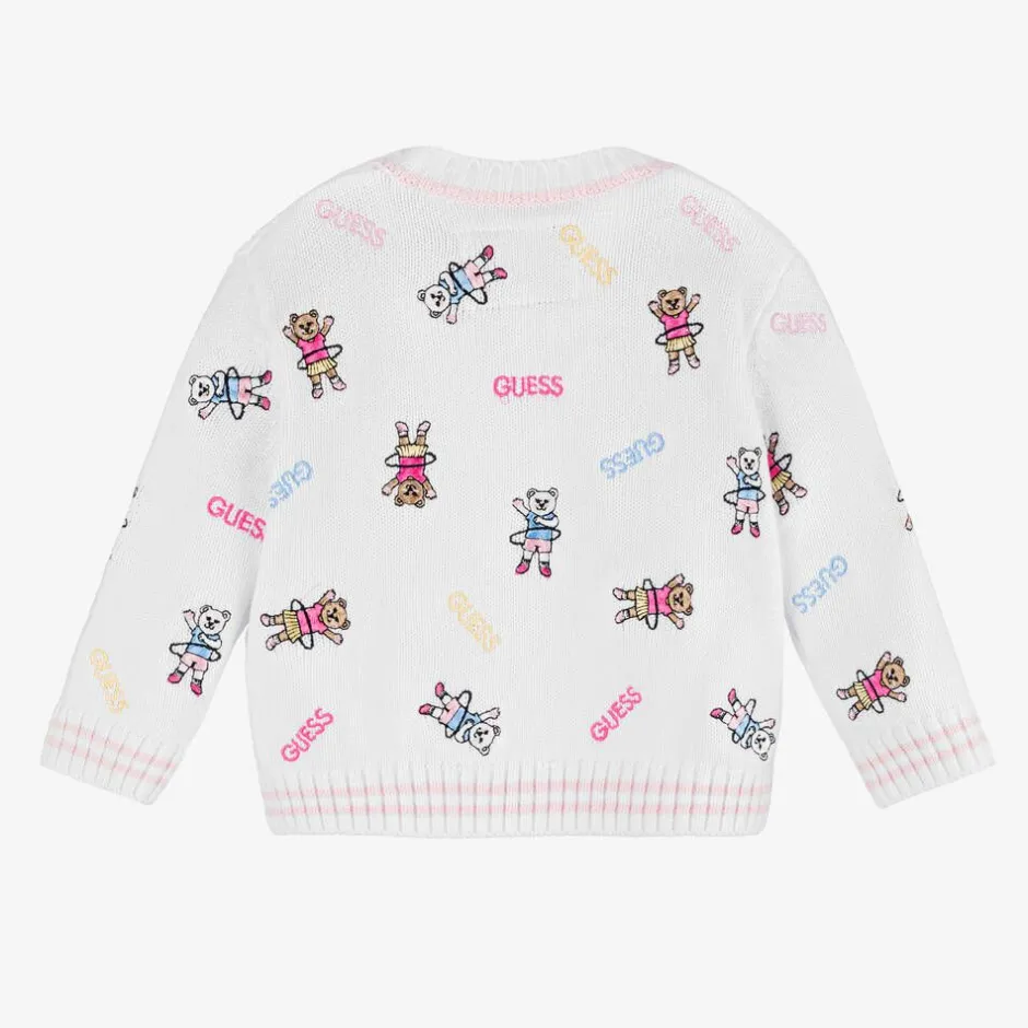 A sweet white cardigan for baby girls by Guess, knitted with cotton for softness and comfort. This cute design is patterned with hula-hooping teddy bears and logo motifs in multicoloured embroidery. It has ribbed trims with striped detailing and heart-shaped buttons on the front in light pink. This item contains organic cotton fibres.