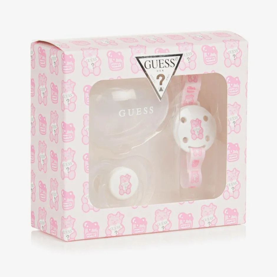 A white dummy and clip set for baby girls by Guess, with sweet pink teddy bear design. The set comprises a logo-branded dummy, a matching dummy clip and a storage case. Lovely for a new arrival, it is presented in a branded box.